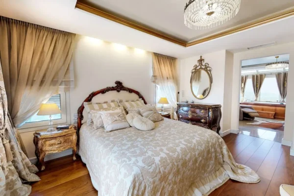 – **Luxurious Master Suite**: The villa’s main floor houses a **luxurious master bedroom** with a **private bathroom and Jacuzzi**, providing a true retreat with direct access to the garden and pool. Another **master bedroom** on the upper level features a **private veranda** with unbeatable views of the mountains and the sea.